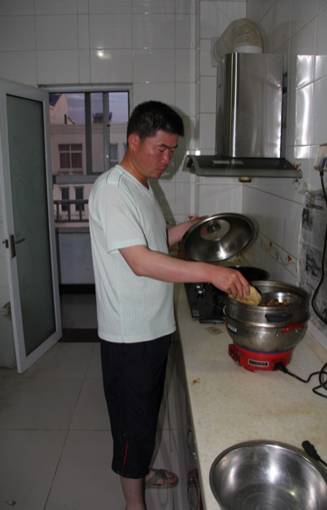老楊正在準(zhǔn)備早餐 老楊在乘車站點等待班車