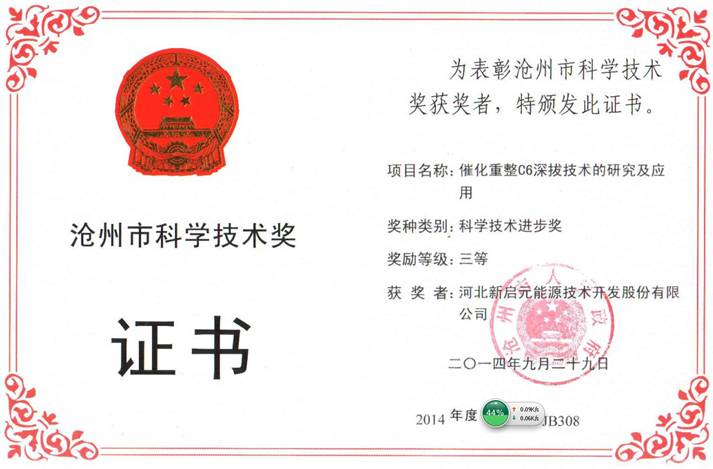 2014年10月13日河北新啟元能源技術(shù)開發(fā)股份有限公司獲得滄州市科學(xué)技術(shù)獎三等獎,獲獎項(xiàng)目為《催化重整C6深拔技術(shù)的研究及應(yīng)用》。項(xiàng)目主要完成人李志剛、喬樹華、劉海軍、劉立新、鄭擁軍。