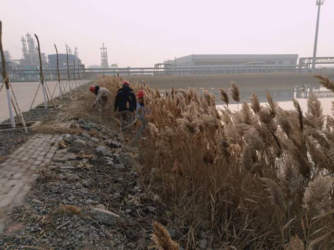 細問之下了解到,原來是運行六部的尾氣硫酸銨二班、水廠二班、污水二班的員工們看到景觀湖周圍干枯的蘆葦影響了公司整體環(huán)境的美觀,同時面臨氣候干燥的冬季容易成為火災隱患。為此,班長們主動溝通交流,利用休班時間自動自發(fā)的對景觀湖蘆葦進行清理。