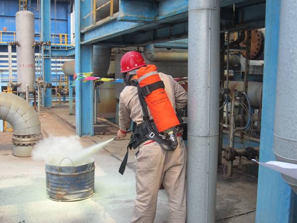 佩戴正壓式呼吸器的參賽人員正在使用滅火器滅火