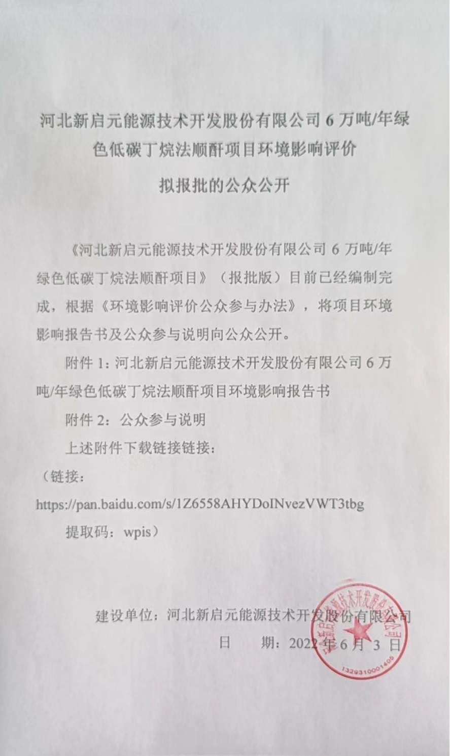 河北新啟元能源技術(shù)開發(fā)股份有限公司6萬噸/年綠色低碳丁烷法順酐項(xiàng)目環(huán)境影響評(píng)價(jià)擬報(bào)批的公眾公開